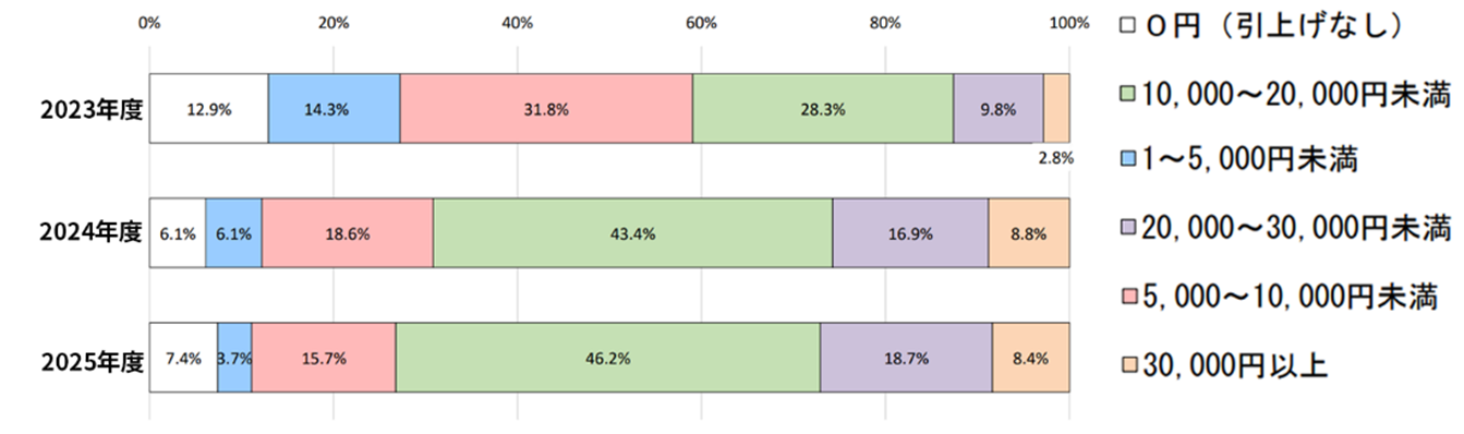 一方、引上げ額が1万円未満だった企業の割合は減少しました。「1~5,000円未満」「5,000~1万円未満」を合わせて19.4%で、5.3ポイント低下しました。