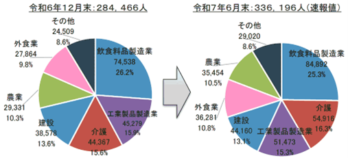 分野別で6年12月末から7年6月末にかけた増加幅が最も大きいのは「介護」で、1万549人増加しました。次いで「飲食料品製造業」が1万354人増、「外食業」が8417人増となっています。