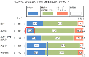 一般社団法人日本能率協会が新入社員向け公開教育セミナーの参加者657人を対象に行った調査で、AIの利用経験や仕事での利用意欲には学歴間で差があることが判明しました。「AIを使って仕事をしたいですか」と尋ねたところ、高卒の15.5%が「できればしたくない」と答えています。「(積極的に)したい」は13.0%で、大卒の34.8%、高専・専門・短大卒の25.9%に比べて低くなっています。