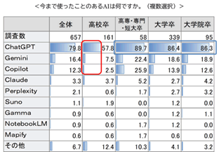 今まで使ったことがあるAIの種類を尋ねた設問では、「ChatGPT」が79.8%で最も高くなりました。一方、高卒者に限ると、57.8%しか利用経験がありません。同協会人材戦略研究所の牧野光昭所長は、「高卒は大卒や短大卒に比べて授業でAIを利用する機会が少ない」と指摘。「企業は全社員のITリテラシーを底上げする体系的な教育機会を提供し、スタートラインを揃える必要性が高まっているのではないか」と分析しています。同協会では、新入社員とマネジメント層の双方に向けた、AI活用研修の開講を検討しています。